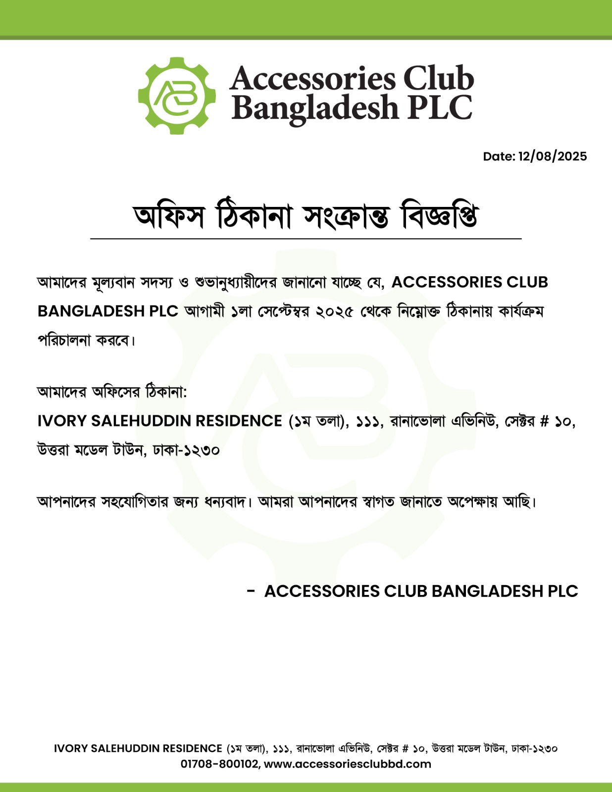 আমরা আশা করি, নতুন ঠিকানায় এসে আপনারা আগের মতোই আমাদের পাশে থাকবেন এবং একসাথে Accessories Club Bangladesh PLC-কে আরও সমৃদ্ধ করে তুলবেন।